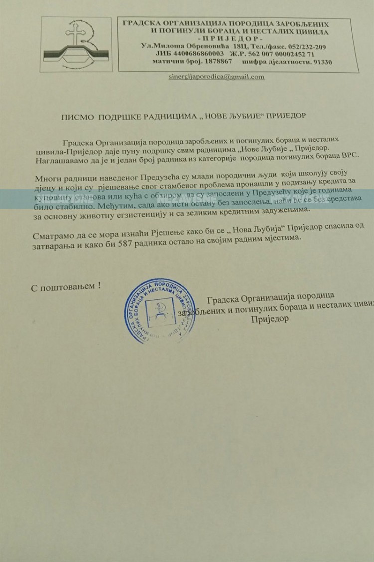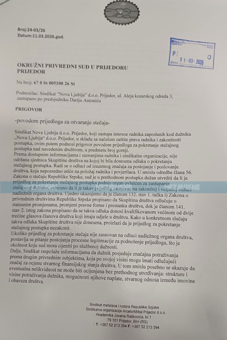Sindikat „Nove Ljubije“ Prijedor podnio je prigovor Okružnom privrednom sudu u Prijedoru povodom prijedloga za pokretanje stečajnog postupka nad ovim preduzećem, tražeći od suda da ispita zakonitost samog prijedloga, ali i stvarno finansijsko stanje društva.